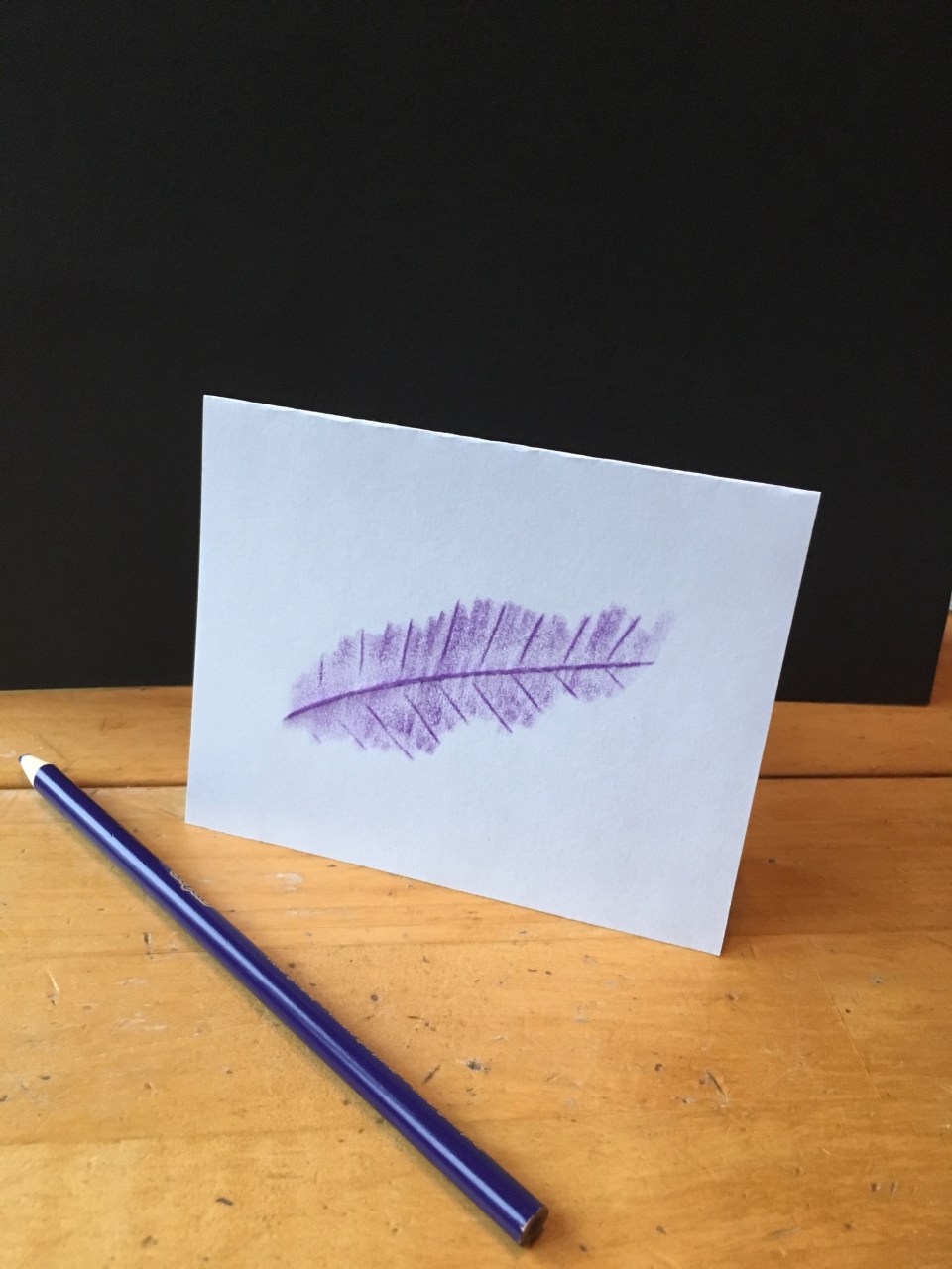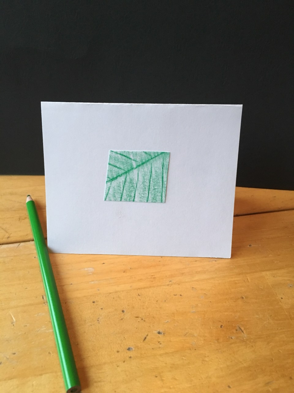 This achieves a different look. I also write a brief description in pencil on the back of the card reflecting my method, such as ‘relief rubbing of chestnut leaf with colored pencil’. It adds to the card’s character, and also provides the information.