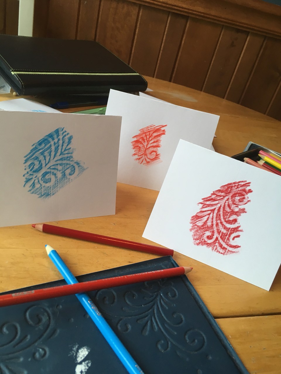 Rubbings with colored pencil work best if the pencil is sharpened but not the “first use” of the freshly sharpened pencil. Dull it a little bit on another piece of paper, and be sure to hold the pencil more sideways than straight up and down as you go over the item you are rubbing over.