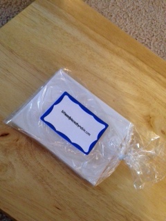 Also, I package these in quantities of six, both cards and invitation size envelopes. Be sure to face one of the finished cards out to properly display it. Clear favor bags with ties, size 10 by 5, work really well to package the card set. The twist tie also allows the package of cards to be opened and re-closed easily. Also, using a blank label sticker, I put a little something on the back of the package. This might be a good place to write a quick message or just a simple To and From.